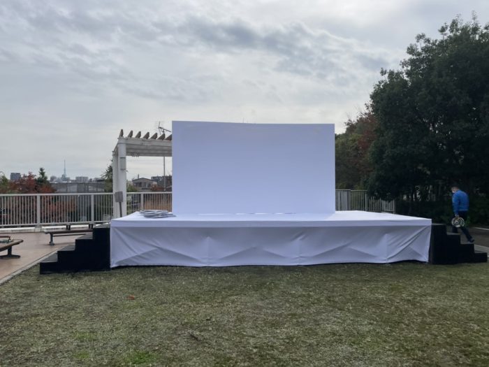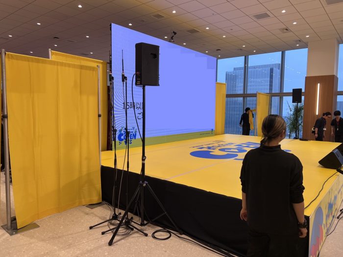 ステージの背景にスクリーンを設置して、屋内でのトークイベントにもご利用いただけます。