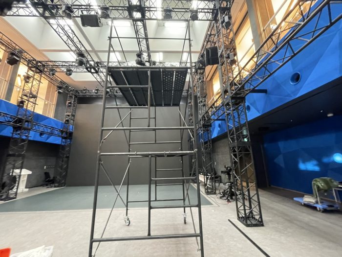 ステージの横や会場後方に設置して、撮影用/照明用などの機材を設置するのに使用されます。