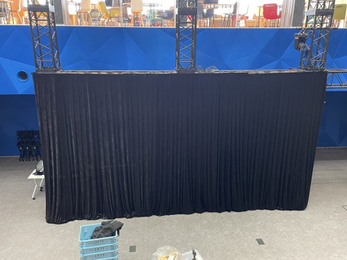 黒のトラスでできたステージに、ステージバック幕を付け、イントレを隠したりもできます♪