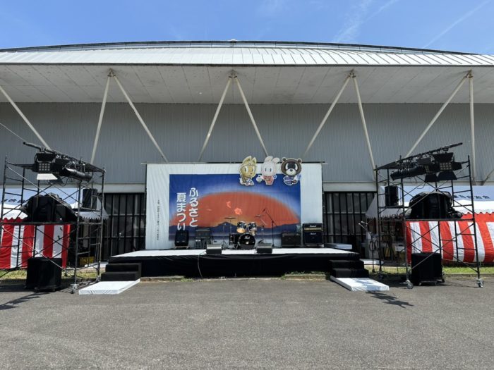 イントレ に照明や音響機材を設置、紅白幕でお祭り感をアップ!