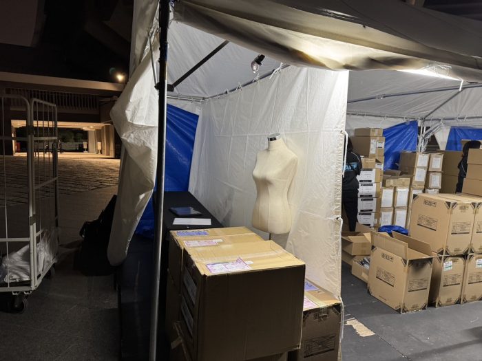 少し内側の骨組に横幕を取り付けて、販売スペースと倉庫スペースのように分けたり
