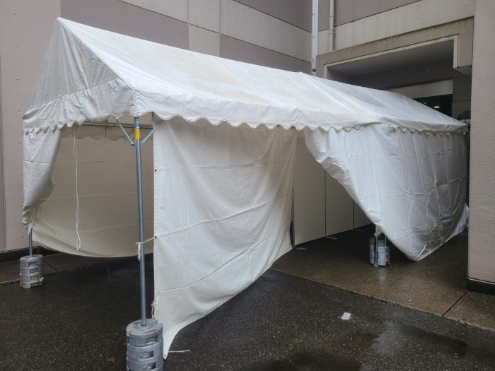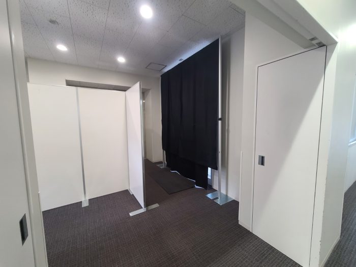 暗幕で窓を隠したり、着替えスペースがない場合は横幕付きテント内に設置したり、
